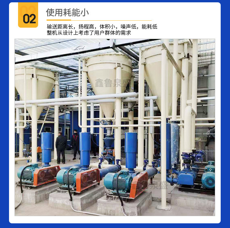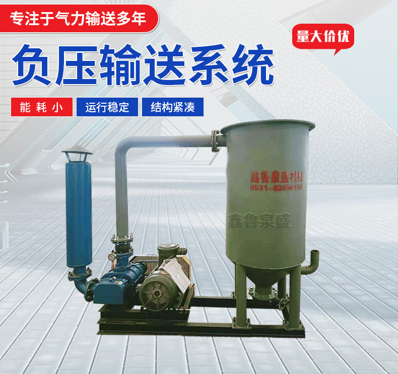 稀相負(fù)壓輸送系統(tǒng)負(fù)壓系統(tǒng)主要利用真空型羅茨風(fēng)機(jī)(或真空泵)在密封管道內(nèi)產(chǎn)生的真空,以低于外界大氣壓的空氣流,通過(guò)吸嘴(或星型給料閥與混合加速室單元)進(jìn)料,再與空氣混合,沿輸料管道吸送到旋風(fēng)分離器進(jìn)行氣固分離,實(shí)現(xiàn)從低處或散裝處多點(diǎn)向高處一點(diǎn)或多點(diǎn)進(jìn)行物料輸送。接收容器中排放輸送物料時(shí),可使用旋轉(zhuǎn)排料閥連續(xù)排放,也可使用閥門間斷排放。